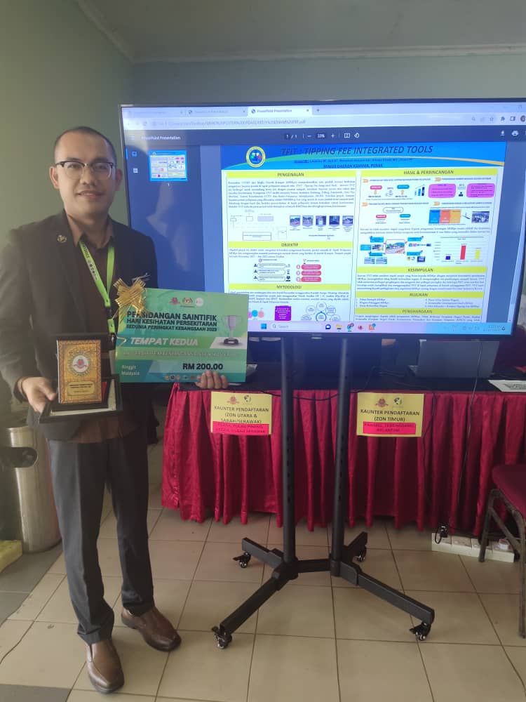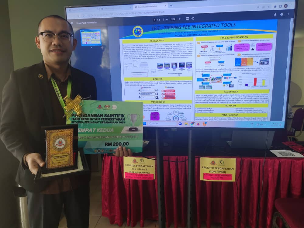 17 Okt 2023 - Majlis Daerah Kampar telah memenangi Naib Johan dalam Pertandingan Saintifik Pembentangan Poster bagi kategori Pihak Berkuasa Tempatan (PBT) di Persidangan Kesihatan Persekitaran Sedunia Peringkat Kebangsaan di Darul Iman Training Centre (DITC) Kemaman, Terengganu. Projek bertajuk Tipping Fee Integrated Tools (TFiT) telah dibentangkan oleh En. Mohd Izham bin Ahmad, selaku ketua kumpulan 1-STEP berjaya memperoleh kemenangan dalam pertandingan kali ini.