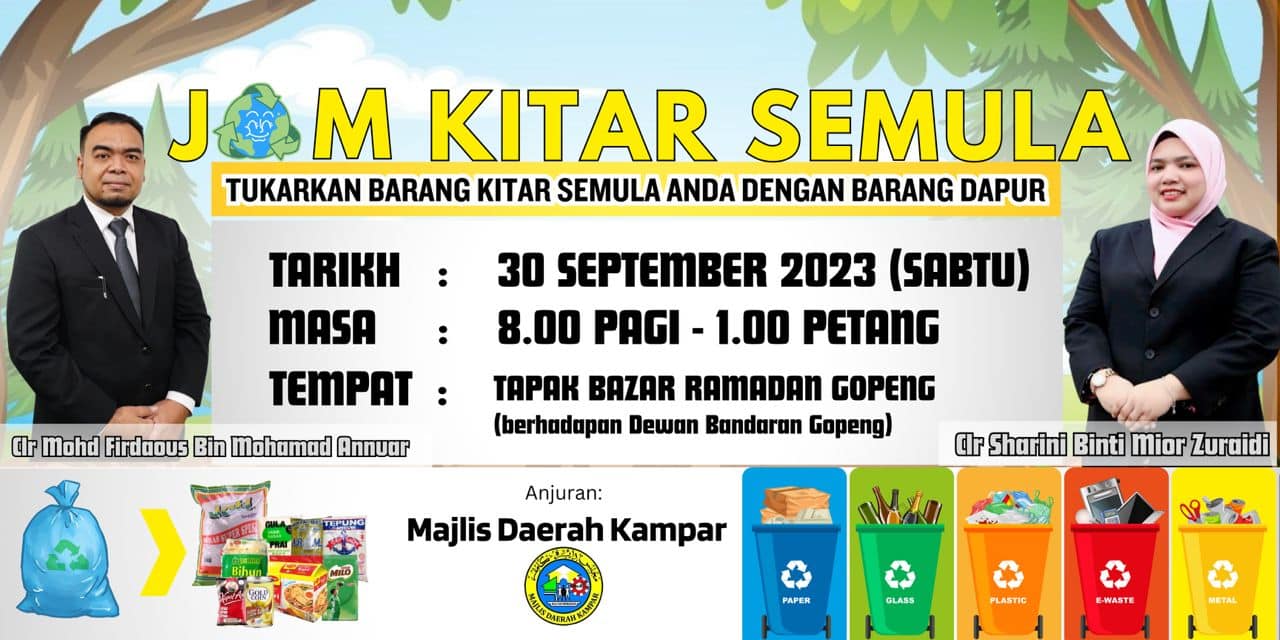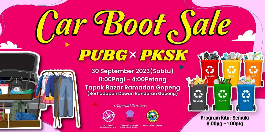 30 September 2023 (Sabtu) - Majlis Daerah Kampar (MDKpr) telah menganjurkan Program Kitar Semula dengan Tukar Barangan Keperluan Harian sempena Program Car Boot Sales bertempat di Dataran Bazar Ramadan Gopeng (hadapan Dewan Bandaran Gopeng).