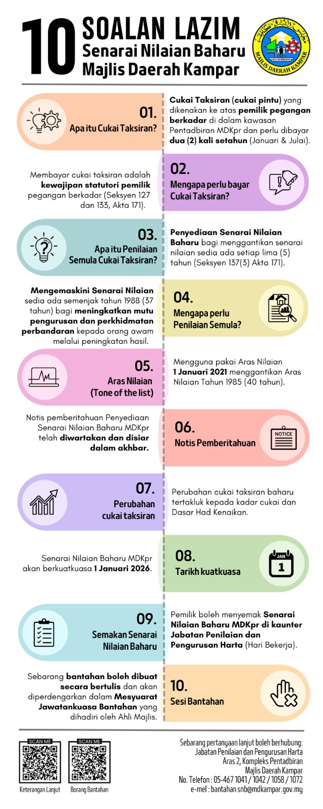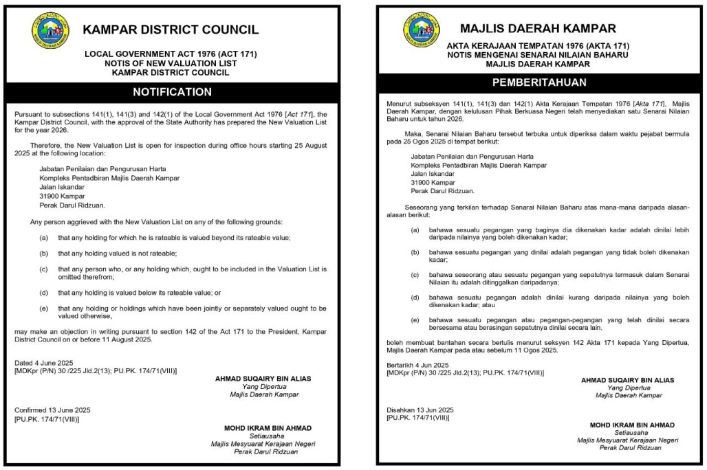 Ini selaras dengan keputusan Majlis Mesyuarat Kerajaan (MMK) Negeri Perak Bil. 2163 bertarikh 27 November 2024 dan disahkan pada 11 Disember 2024 berhubung Penguatkuasaan Senarai Nilaian Baharu dan Kadar Baharu Cukai Taksiran di dalam Kawasan Pentadbiran Majlis Daerah Kampar.