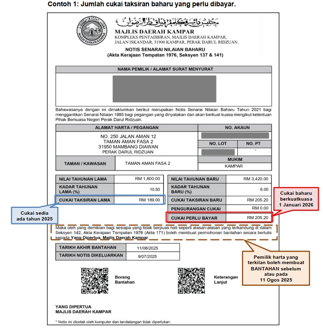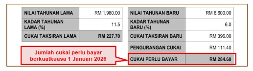 Notis ini tidak perlu dibayar kerana bukan bil cukai taksiran. Ini hanyalah notis pemakluman awal kepada pemilik tentang pengenaan nilaian baharu ke atas pegangan (harta). Bil cukai taksiran baharu boleh diperolehi mulai 01 Januari 2026.
