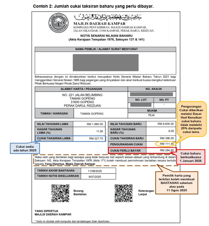 Sekiranya pemilik pegangan (harta) tidak berpuas hati atau terkilan dengan Senarai Nilaian Baharu, maka bolehlah mengemukakan bantahan sebelum atau pada 11 Ogos 2025.