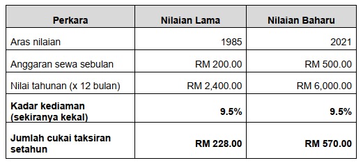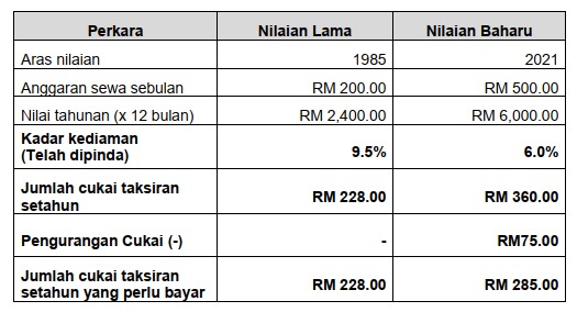Bagi pegangan harta yang tiada perubahan matan atau penambahan ruang lantai, had kenaikan cukai taksiran baharu adalah tidak melebihi dua puluh lima peratus (25%) daripada cukai taksiran lama (cukai semasa).